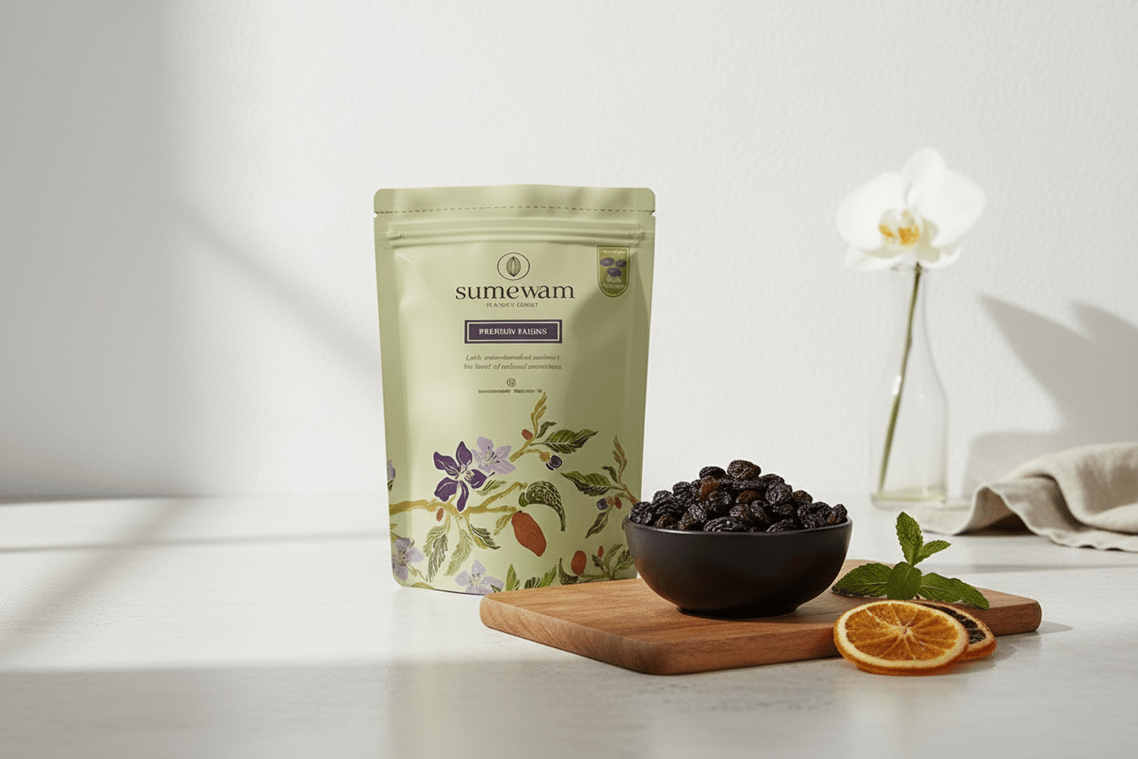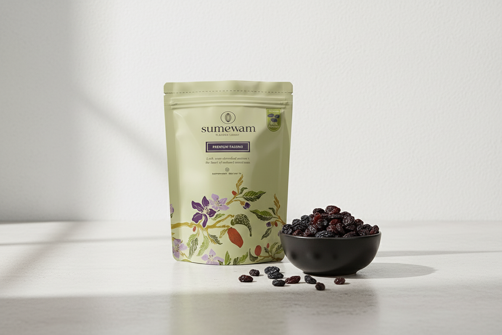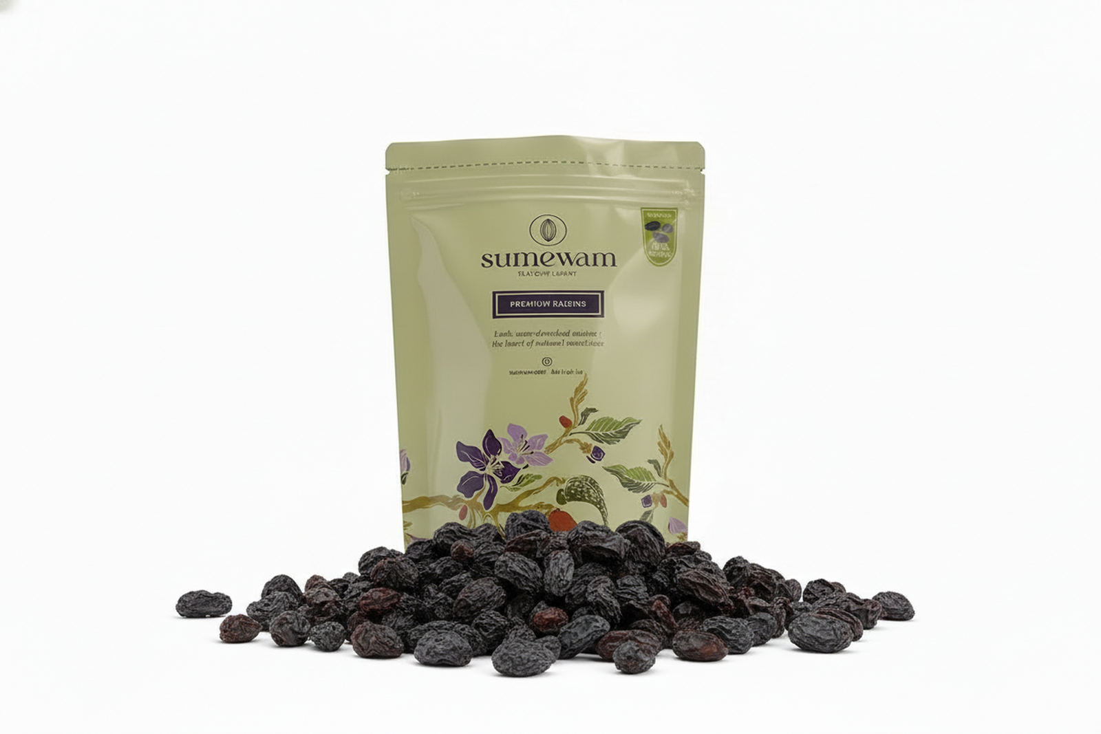 Sumewam brings you Premium Seedless Black Raisins — handpicked, naturally sun-dried, and packed to preserve their natural sweetness and nutrition. Known for their deep flavour and soft, juicy texture, these black raisins are perfect as a ready-to-eat snack or for enhancing cereals, desserts, and traditional recipes.